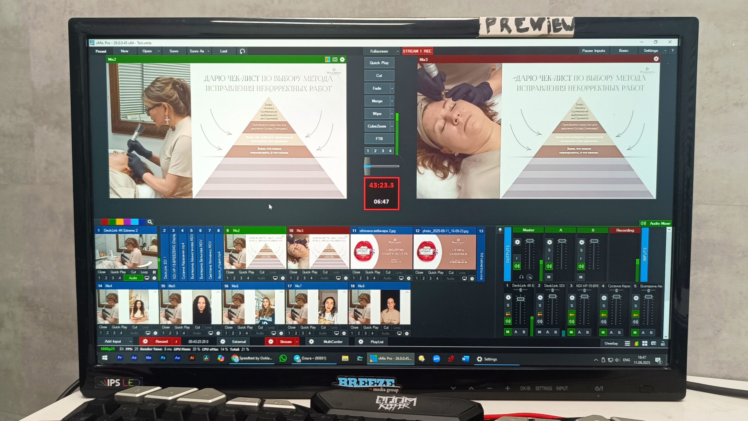 Недавно на Петроградской стороне мы реализовали выездную трансляцию для клиники эстетической медицины. Задача была непростая: показать харизму ведущего врача и ювелирную точность работы с лицом пациентки — и сделать это не в студии, а прямо в рабочем пространстве клиники. Также в прямом эфире поучаствовали три удаленных спикера из разных стран.
